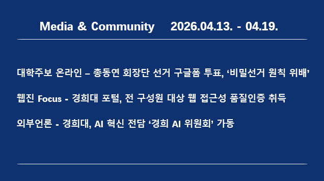 미디어센터 총동연 회장단 선거 구글폼 투표, ‘비밀선거 원칙 위배’ 지적이후승 기자 2026-04-20 hit 29지난 4월 13일부터 19일까지 우리학교 관련 한 주간의 미디어·여론 동향을 살펴본다.