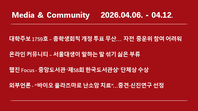 미디어센터 서울대생이 말하는 말 섞기 싫은 부류이후승 기자 2026-04-13 hit 95지난 4월 6일부터 12일까지 우리학교 관련 한 주간의 미디어·여론 동향을 살펴본다.