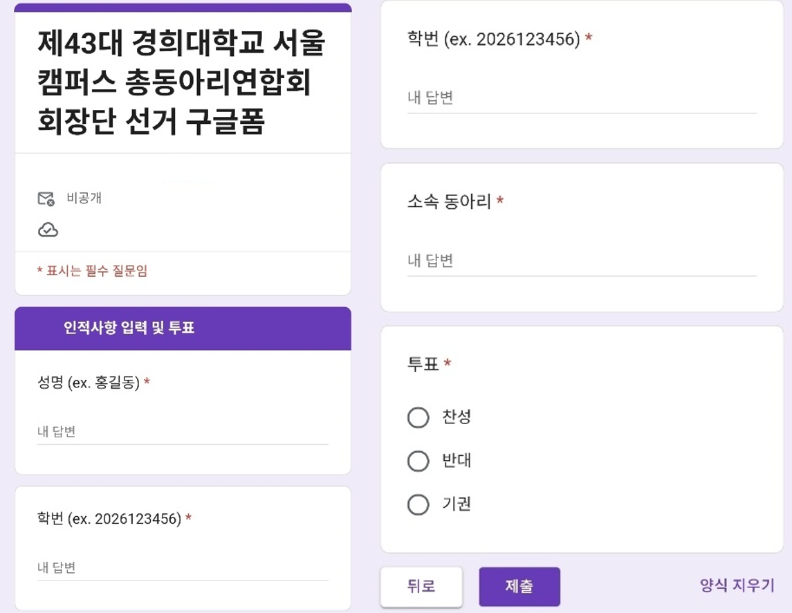 대학주보 총동연 회장단 선거 구글폼 투표… ‘비밀선거 원칙 위배’ 지적김예찬 기자 2026-04-17 hit 116이번 구글폼 투표는 응답과 개인정보가 함께 수집되는 구조로 운영돼 비밀선거 원칙 위배 가능성이 제기됐다.