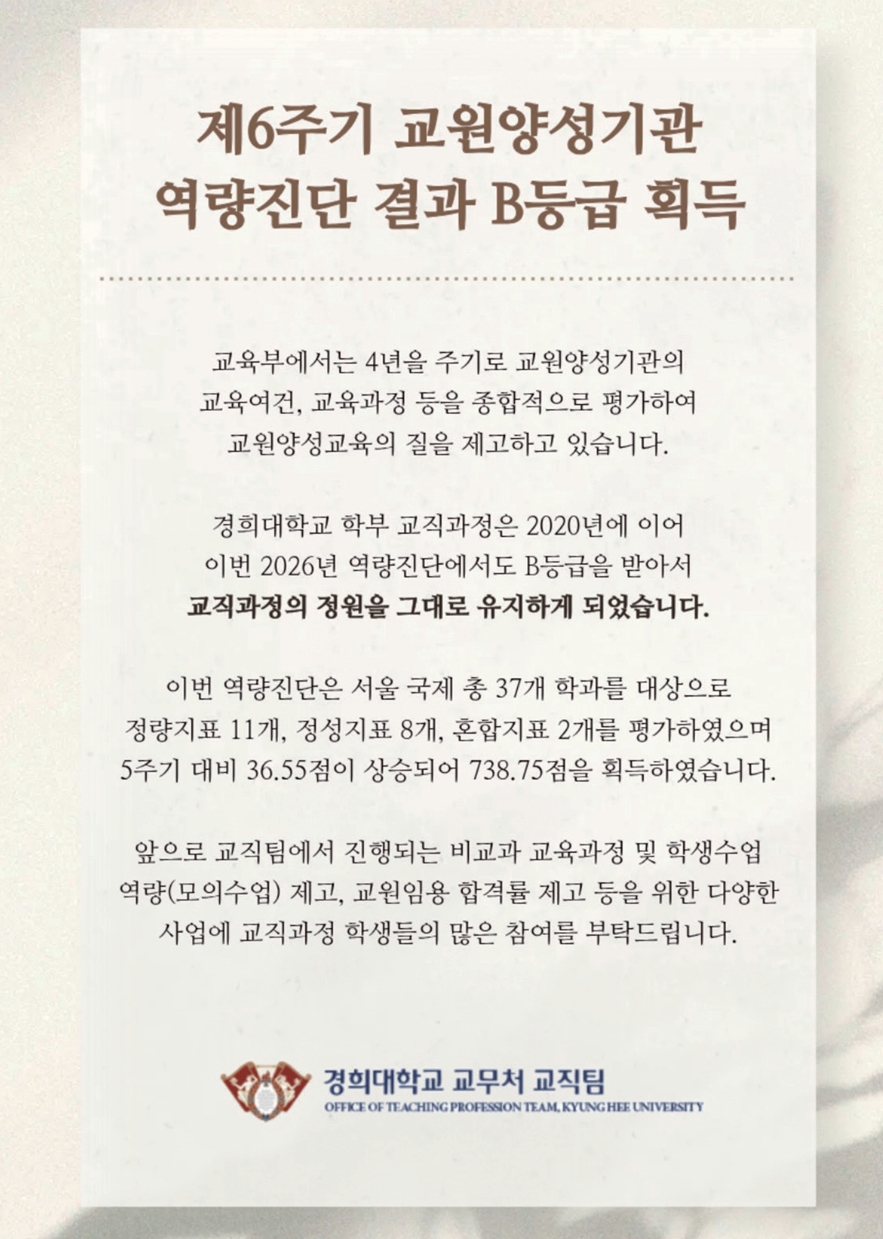 대학주보 교원양성기관 역량진단 B등급 전공교육 전임교원 확보는 숙제김가빈 기자 2026-04-11 hit 95우리학교 학부 교직과정과 교육대학원이 교육부와 한국교육개발원이 실시한 ‘6주기(2022~2025) 교원양성기…