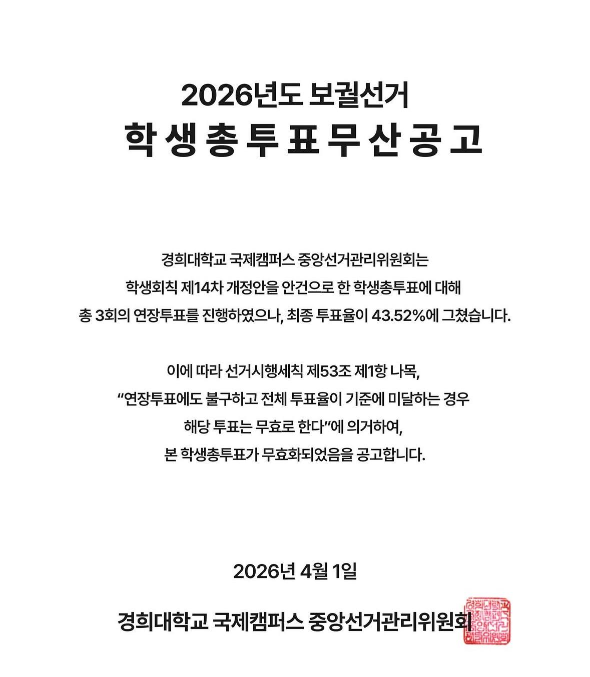 대학주보 총학생회칙 개정 투표 무산…자유전공학부 중운위 참여 어려워권도연 기자 2026-04-11 hit 110【국제】 총학생회칙 개정에 대한 학생총투표가 무산되며 자유전공학부(자전)는 올해도 중앙운영위원회(중운위) 참…