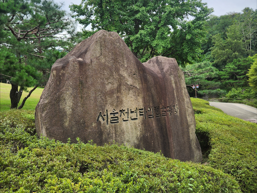 A stone monument marks the entrance to the Seoul Millennium Time Capsule Plaza, symbolizing the city’s connection between past, present, and future.