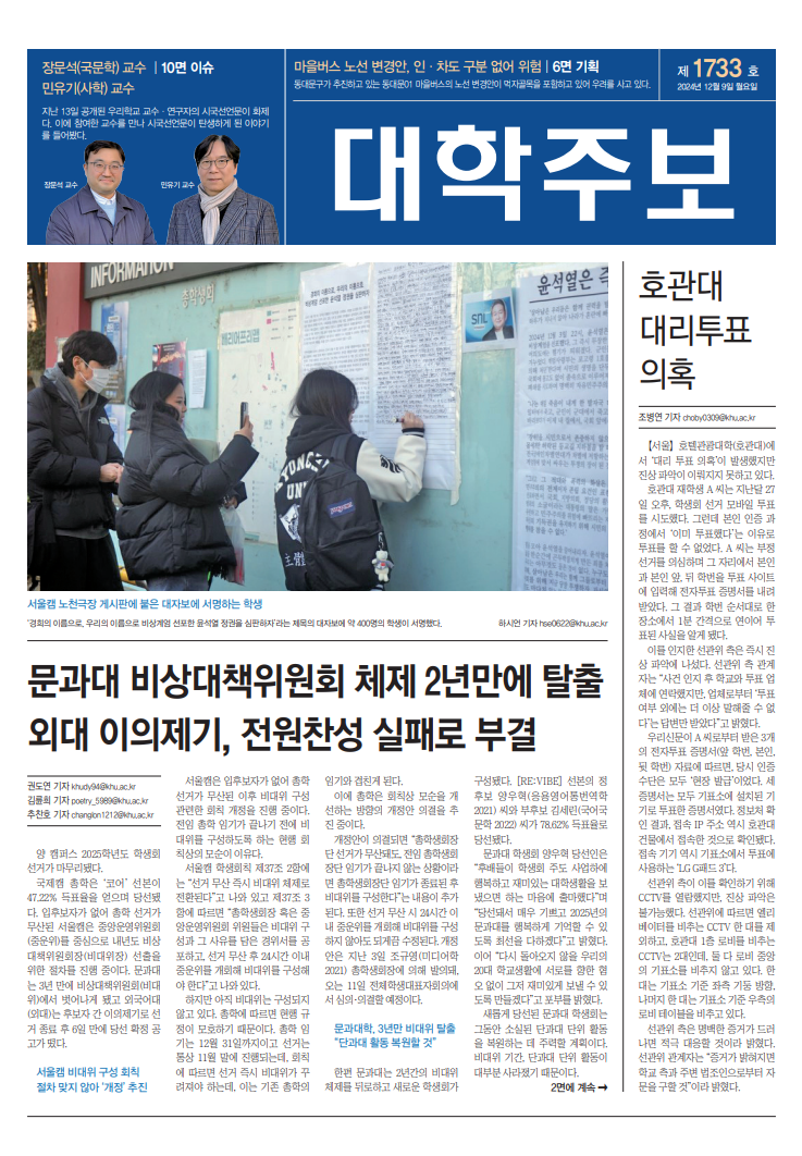 문과대 비상대책위원회 체제 2년만에 탈출, 외대 이의제기, 전원찬성 실패로 부결