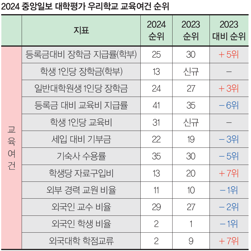 중앙일보 대학평가는 총 네 개의 부문으로 분류된다. ▲교수연구(총점 95점) ▲교육여건(총점 75점) ▲학생성과(총점 80점) ▲평판도(총점 40점)다. 그 중 ‘교육여건’ 부문에서 ‘외국인 학생 비율’과 ‘외국대학 학점교류’ 지표를 제외한 모든 지표가 10위권 밖이었다.