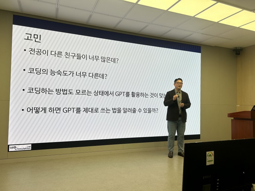 연사자로 나선 강전영 교수는 데이터로 지역 문제를 진단하고 대안을 고민하는 지리학자다. 프로그래밍 전문가는 아니지만, LLM(AI 챗봇 기술을 가능하게 하는 대규모 언어모델)에 관심이 많다. 강 교수는 “지난번 특강에서 소프트웨어융합학과 박상근(지식서비스공학) 교수가 150명 정도 되는 대형 강의에서의 활용 경험을 이야기했다면, 이번에는 20명 정도 되는 소규모 코딩 강의에서 어떻게 생성형 AI를 활용하는지 얘기해보려 한다”고 운을 뗐다.