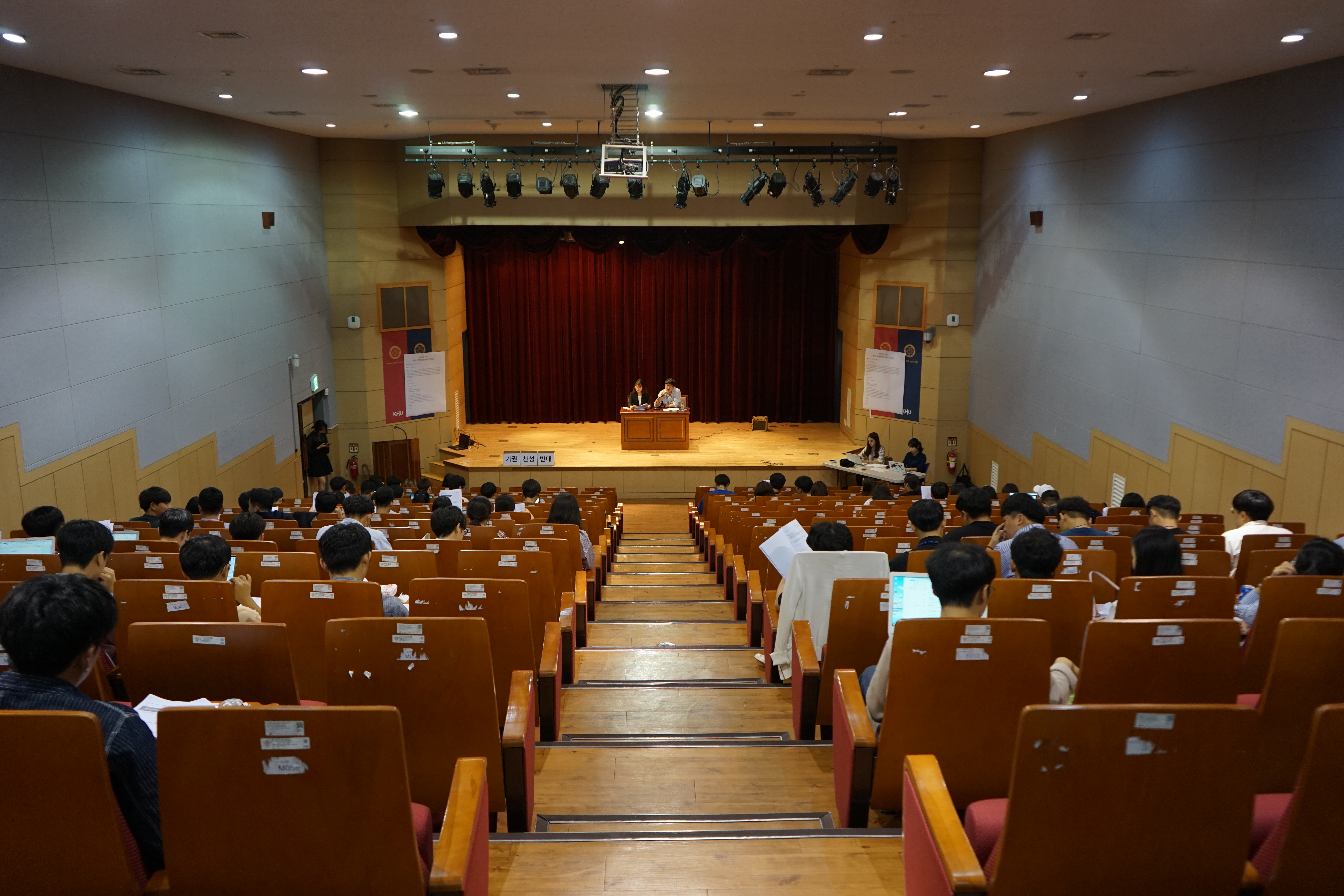 ▲청운관 지하 1층에서 온·오프라인 병행으로 열린 교수법 특강. 오프라인 현장을 찾은 교수들이 강전영 교수의 강연에 귀 기울이고 있다. (사진=이지수 기자)
