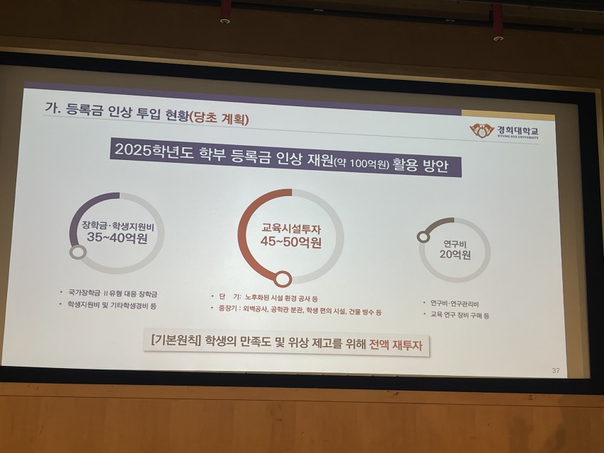 ▲등록금 인상으로 확보된 약 100억 원 규모의 재원 집행 내역 (사진=김규연 기자)