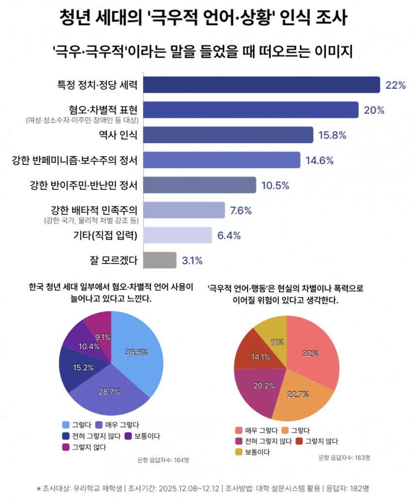 우리신문은 ‘청년세대의 ‘극우적 언어·행동’ 인식 조사’를 지난달 8일부터 12일까지 5일간 실시했다. 설문조사에서 ‘극우’라는 용어를 들었을 때 가장 먼저 연상되는 것을 파악한 결과, ‘특정 정당·정치 세력’에 답한 응답자가 22.0%로 가장 높았고, ‘혐오·차별적 표현’이 20.0%로 그 뒤를 이었다. ‘극우’라는 용어는 비단 정치적 개념에만 국한된 것이 아닌, 특정한 정서·태도를 표현하는 말로 폭넓게 인식되고 있다.