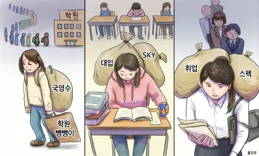 ▲한국 사회에선 초등학교 때부터 사교육을 받으며 경쟁에 뛰어든다. 성인이 되고 대학에 들어와서도 학점과 취업 등으로 인해 끊임없는 경쟁을 하게 된다.