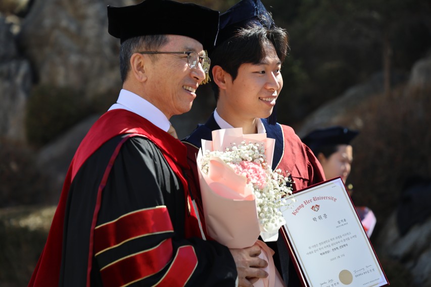 김진상 총장은 축사를 통해 AI 시대를 넘어 비상하는 ‘창조적 실천 지성’을 강조했다. 김 총장은 “오늘은 대학 졸업이라는 끝과 사회인으로서의 출발이 맞물리는 영광스러운 시간”이라며 “AI 기술의 현실화로 미래 사회의 불확실성이 커지고 있지만, 경희에서 학습한 역량을 바탕으로 졸업생들은 창의적 인재로 거듭날 수 있을 것이라 확신한다”고 졸업생들의 새로운 출발을 응원했다.