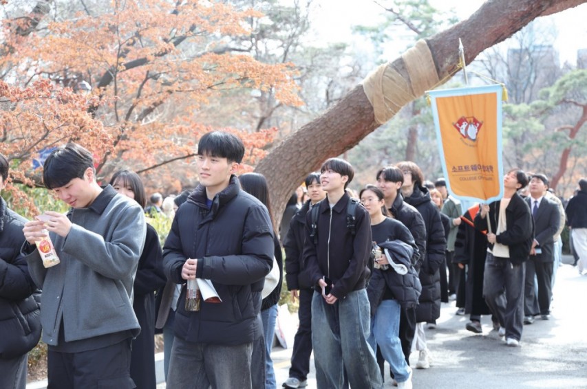 ▲지난 27일 서울캠 평화의 전당에서 2026학년도 입학식이 열렸다. 교시탑에서 시작된 단과대학별 퍼레이드는 레드카펫을 따라 이어지며 새로운 출발을 알렸다. 긴장과 설렘이 교차한 표정으로 행진하던 신입생들은 경희의 이름 아래 첫걸음을 내디뎠다. 김진상 총장은 “대학은 삶의 경계를 넓히는 배움의 공간”이라며 공감과 통찰, 회복력을 갖춘 인재로 성장하기를 당부했다. 가족들은 크라운관에서 실황 중계를 지켜보며 박수로 신입생들을 응원했다. 올해 입학식은 2013년부터 이어진 퍼레이드 전통 속에서 또 하나의 학번을 맞이했다.(사진=이은서 기자)