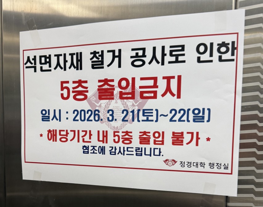 이달 초 정경대학관에 ‘석면자재 철거 공사로 인한 5층 출입금지’라는 안내문이 붙었다. 공사는 지난 21일부터 22일까지 이틀 동안 진행됐다. 지난 2015년 석면은 1급 발암물질로 지정되며 사용이 전면 금지됐다. 현재 우리학교 일부 석면건축물은 사라졌지만 모든 건물을 무석면 건출물로 전환하기 위한 공사는 여전히 진행 중이다.