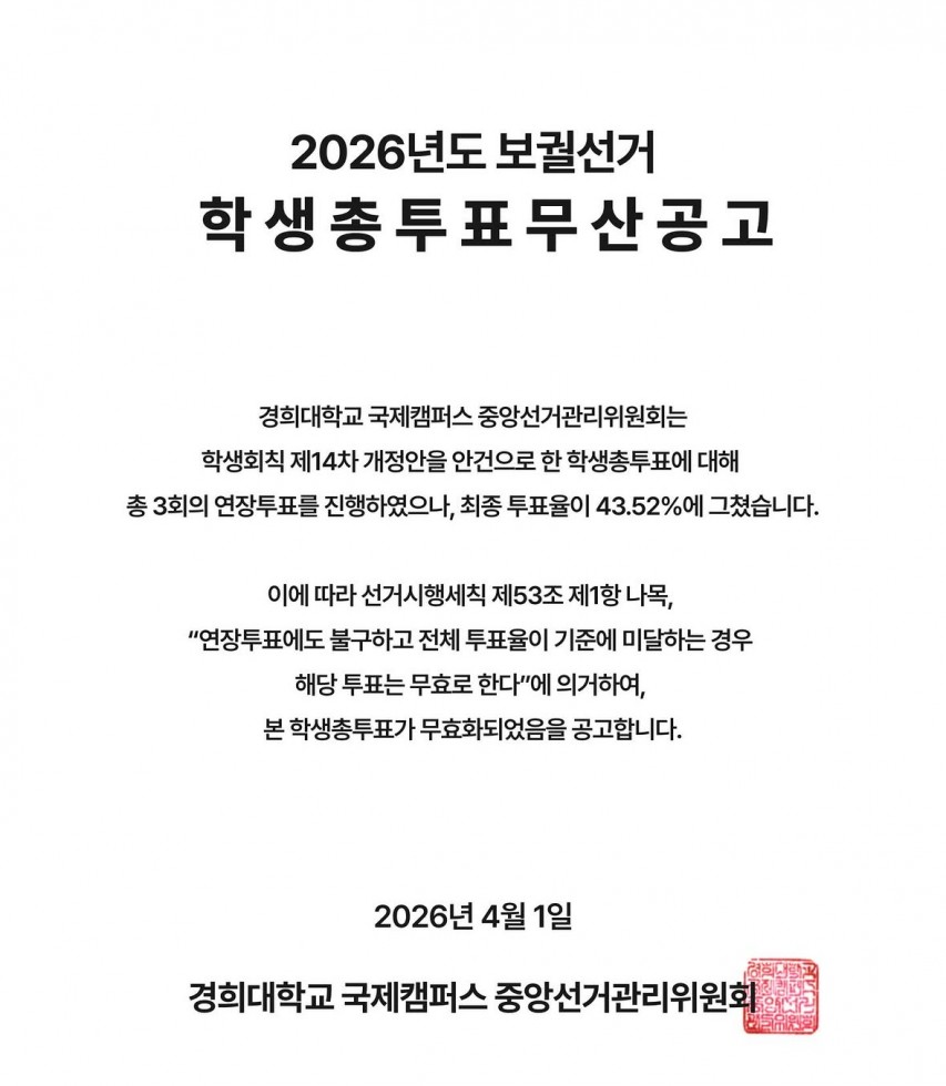 총학생회칙 제14차 개정안을 안건으로 한 이번 학생총투표는 세 차례의 연장투표에도 불구하고 최종 투표율이 43.52%에 그쳤다. 이에 따라 선거시행세칙 제53조 제1항 나목 “연장투표에도 불구하고 전체 투표율이 기준에 미달하는 경우 해당 투표는 무효로 한다”에 의거해 투표가 무산됐다.